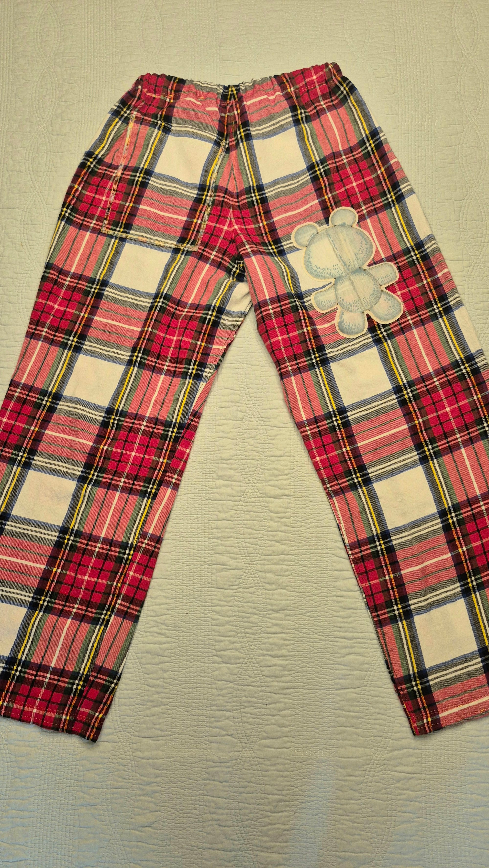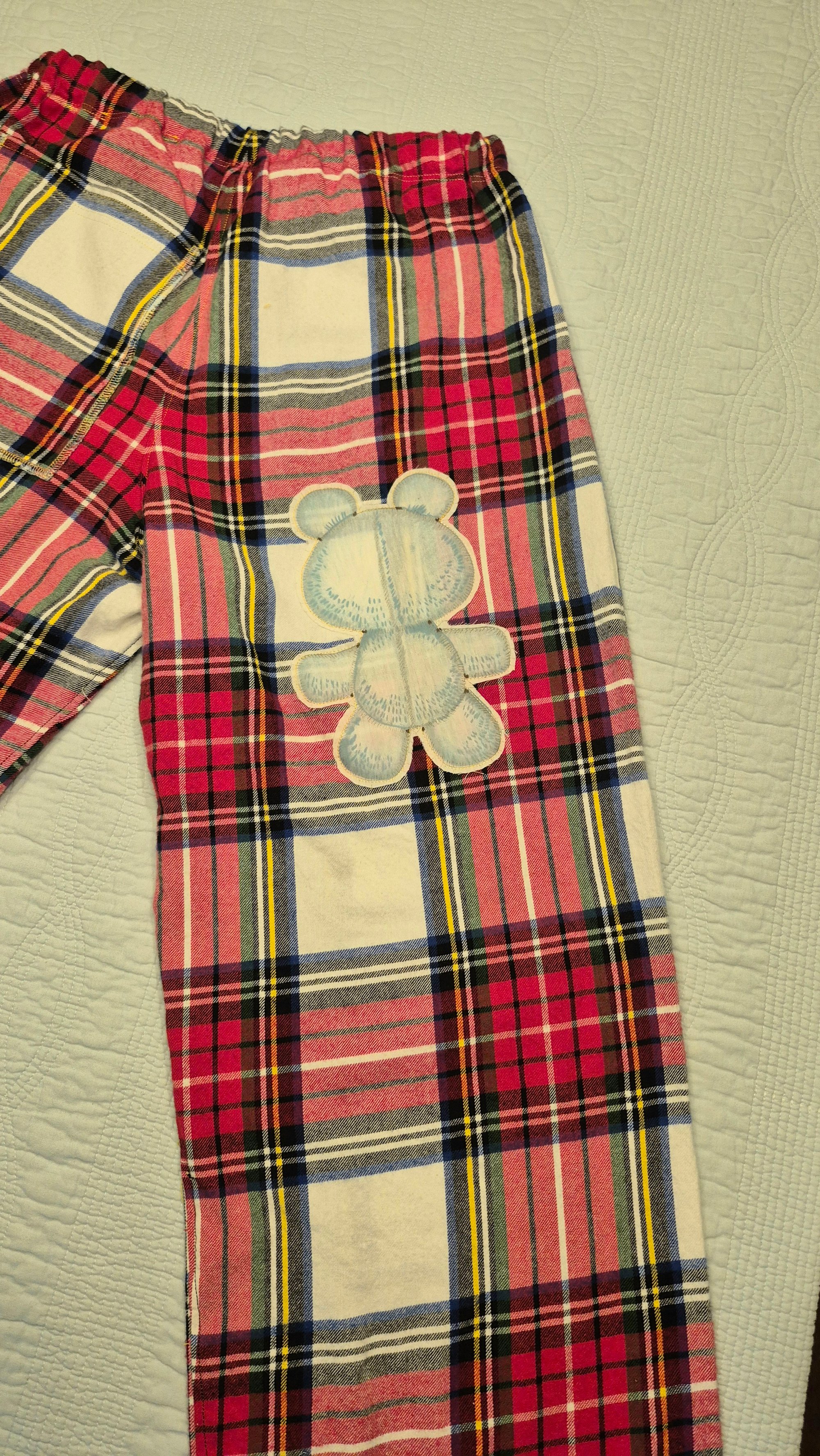 Materials: Modern remnant material in a classic plaid with a vintage 1990s blue bear applique. 100% cotton